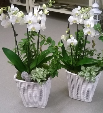 1. Orkidea-asetelma. 2. Orkidea-istutus jossa viherkasveja.