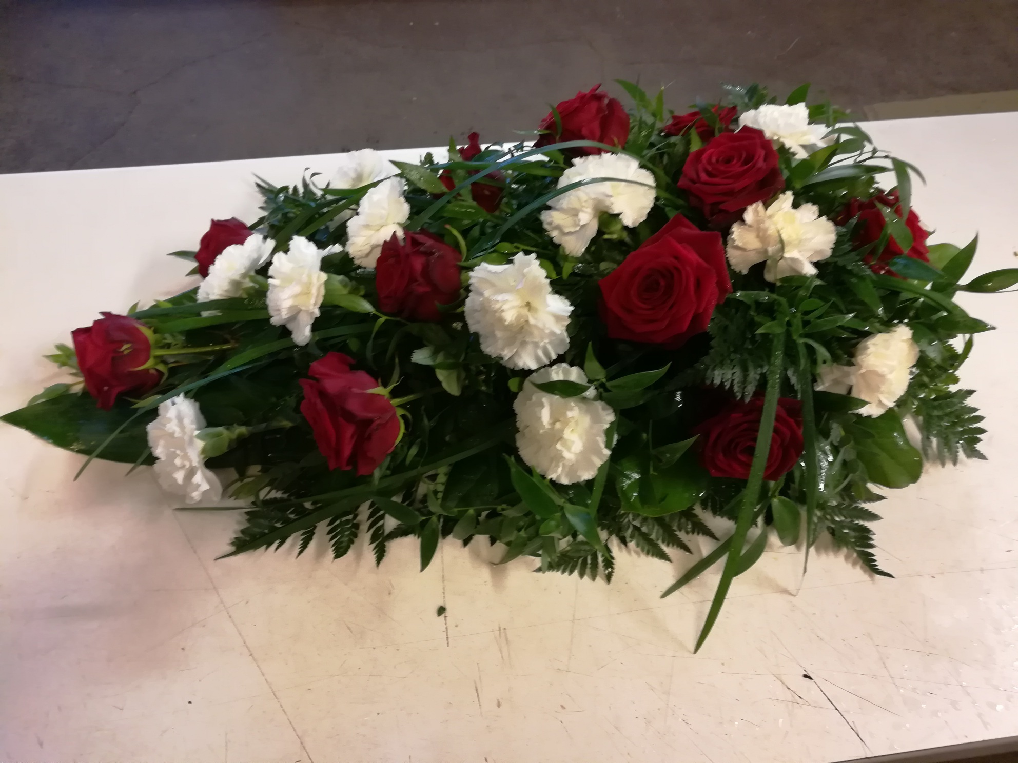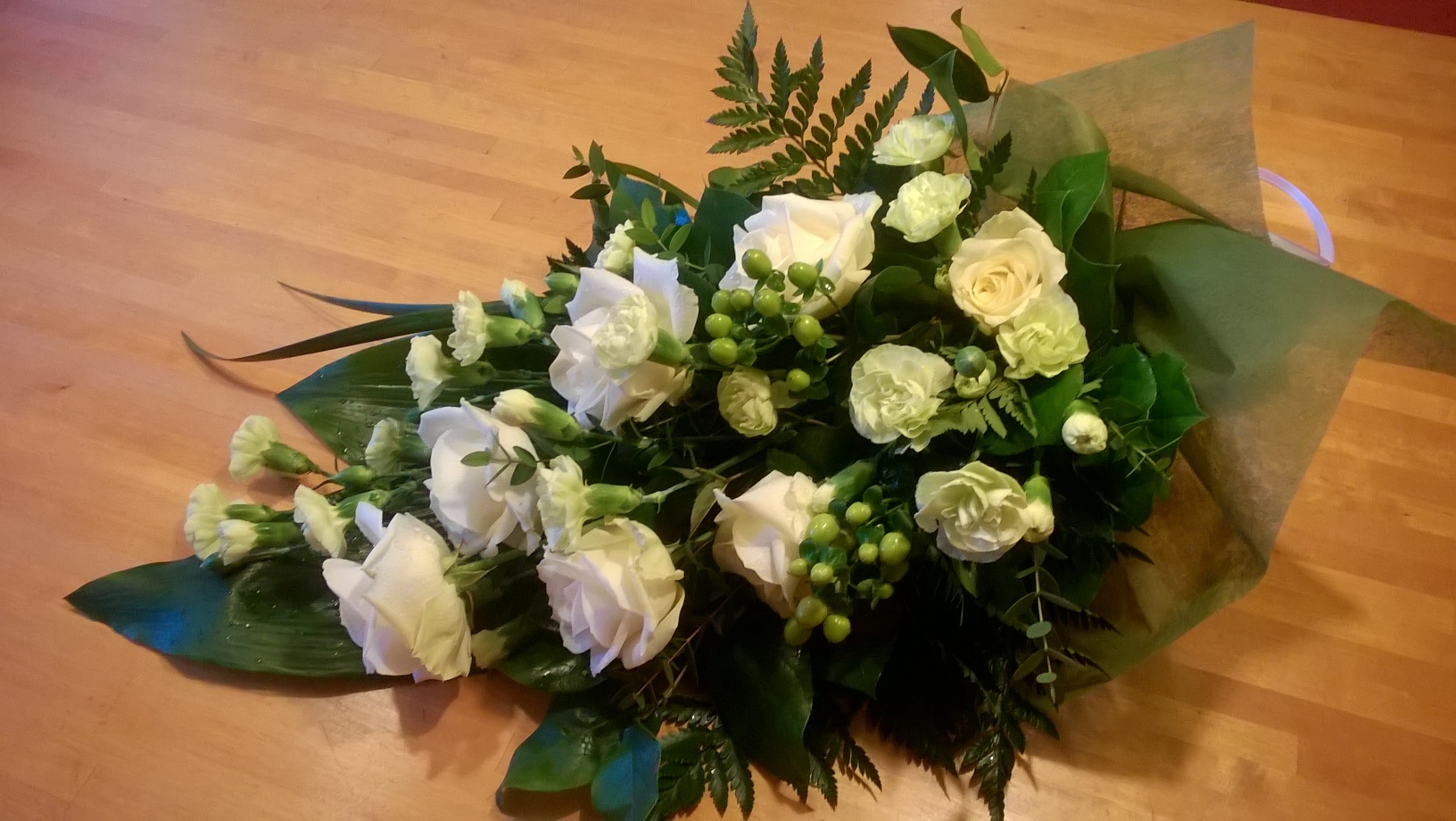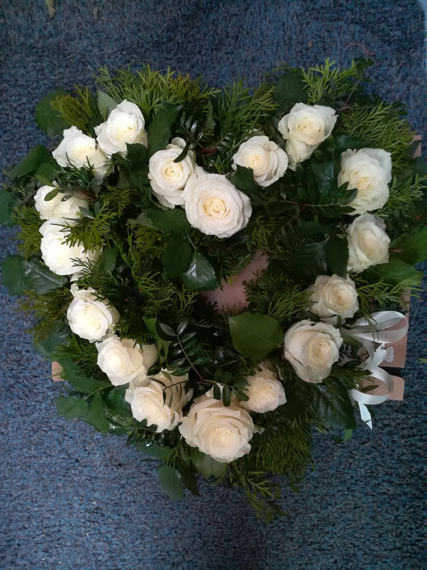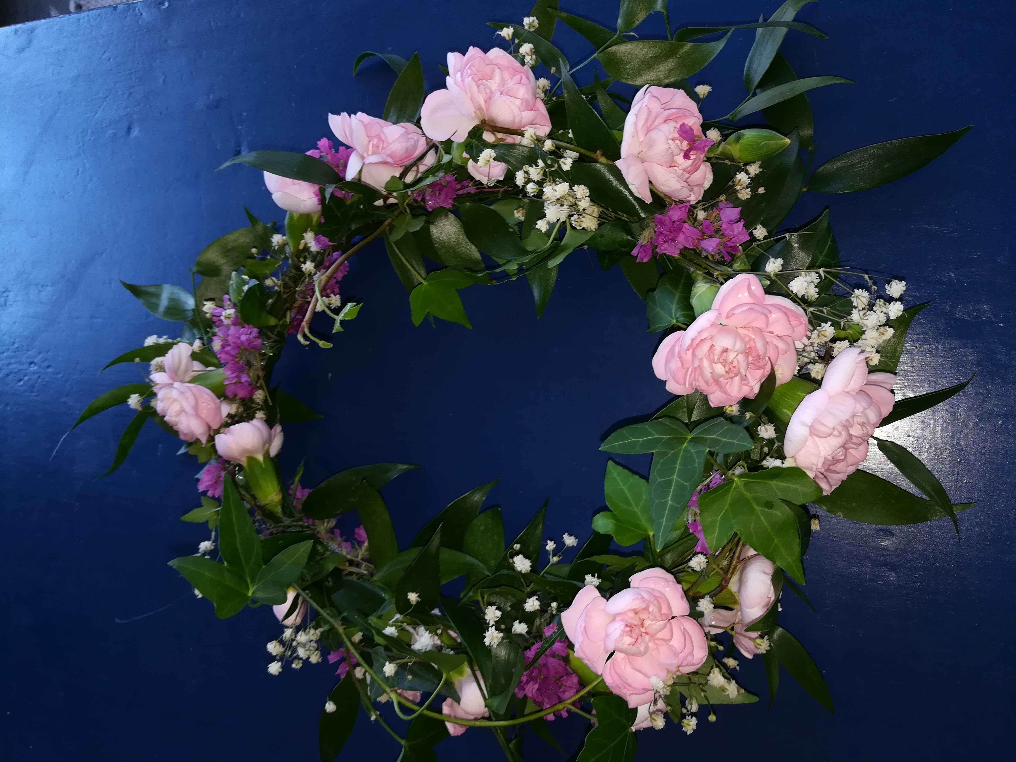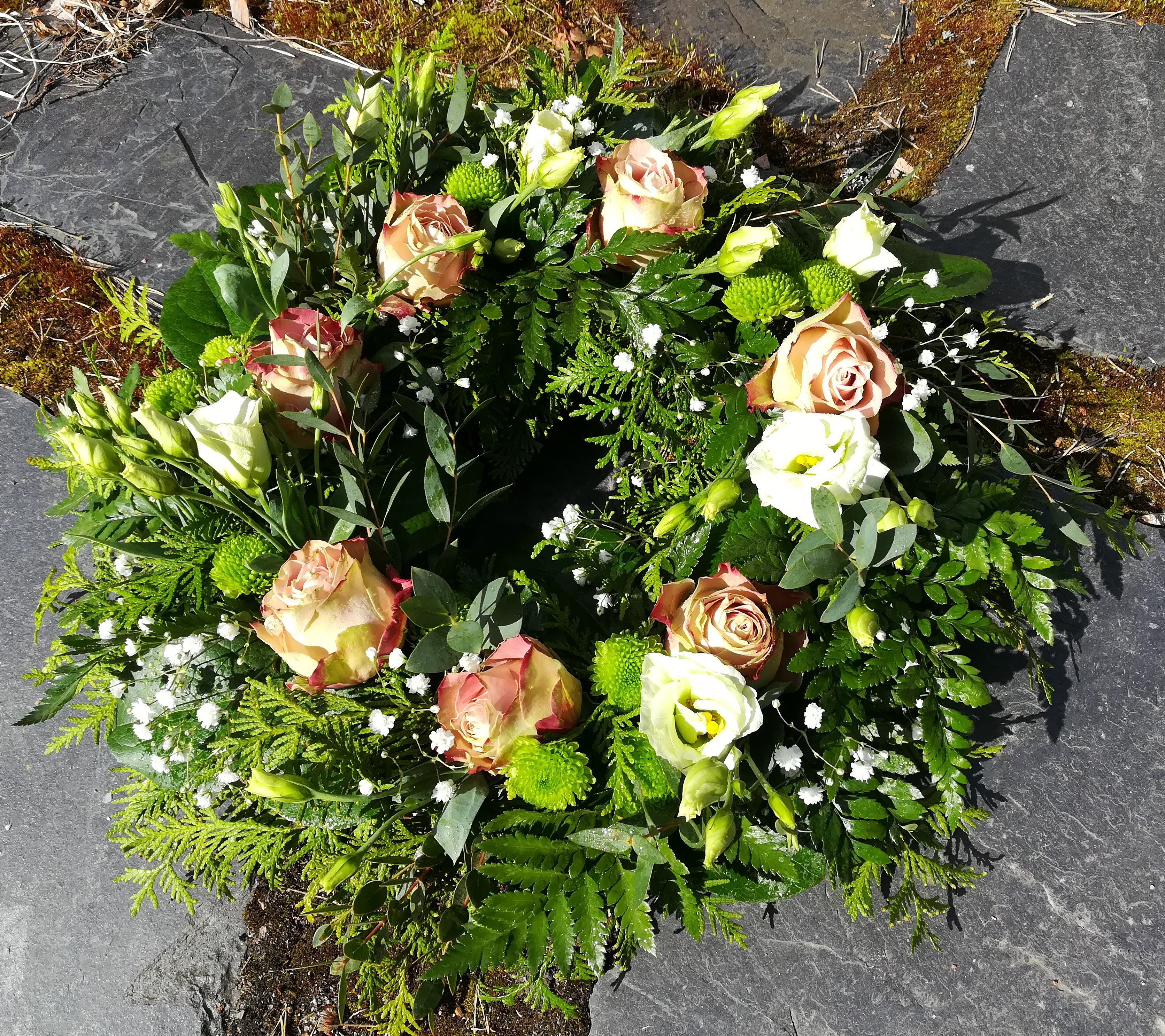 Ruusua, eustomaa, krysanteemia ja harsokukkaa. sydämen muotoinen "seppele."