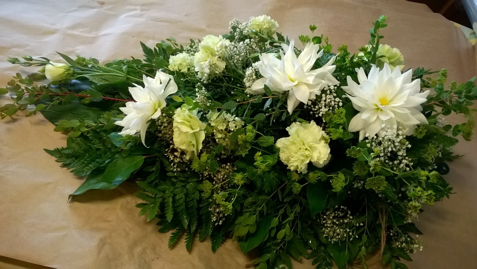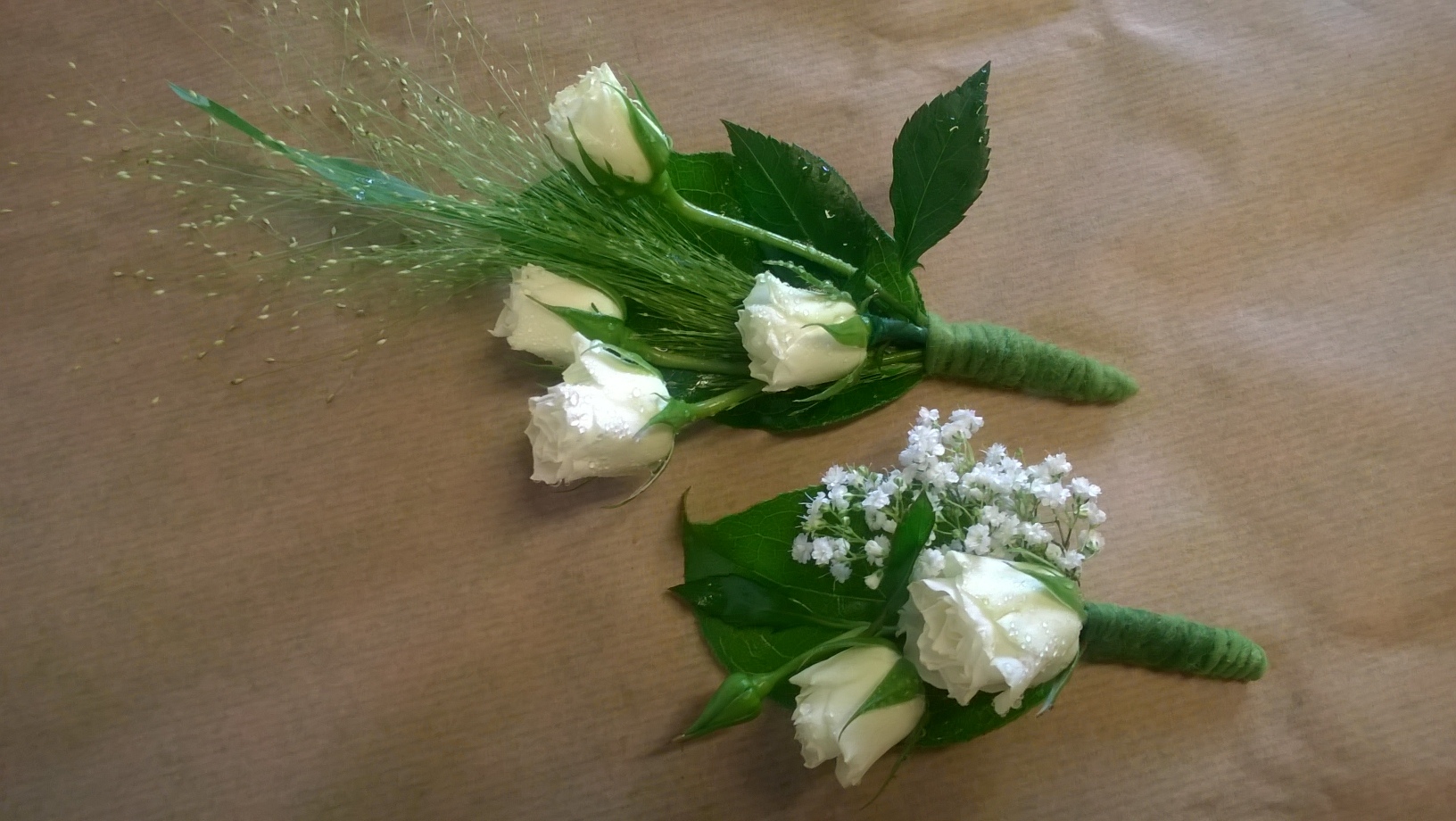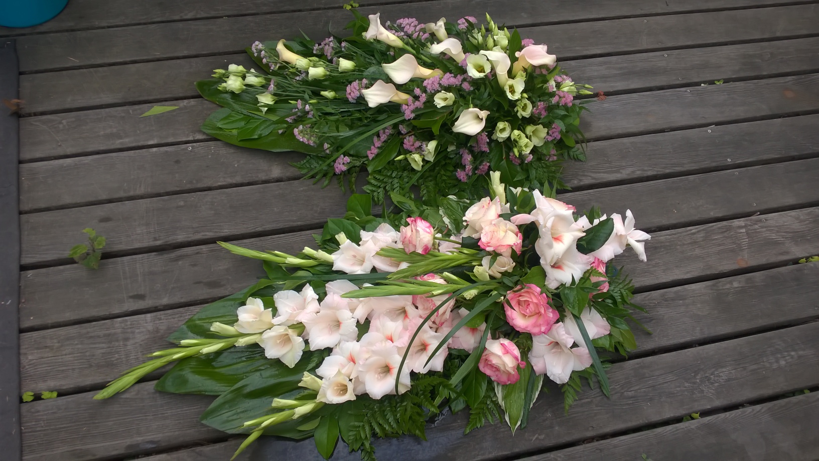 1. Hautavihko jossa ruusua ja neilikkaa. 2. Dahliaa, neilikkaa, harsokukkaa ja bupleurum-jänönputkea.