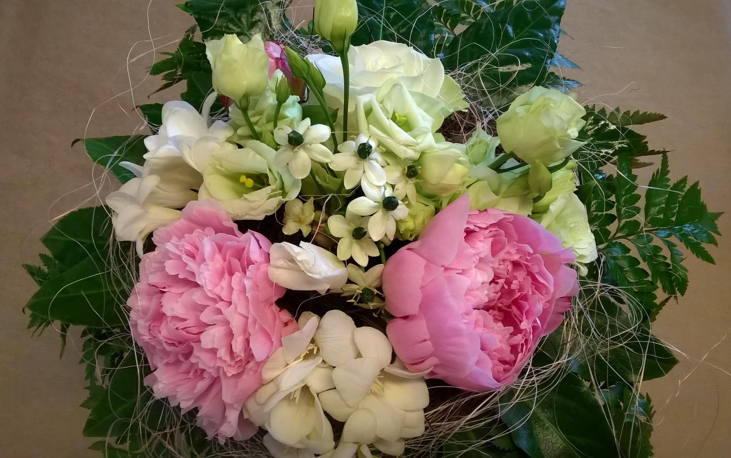 1. Morsiuskimppu, jossa pionia ja ruusua.