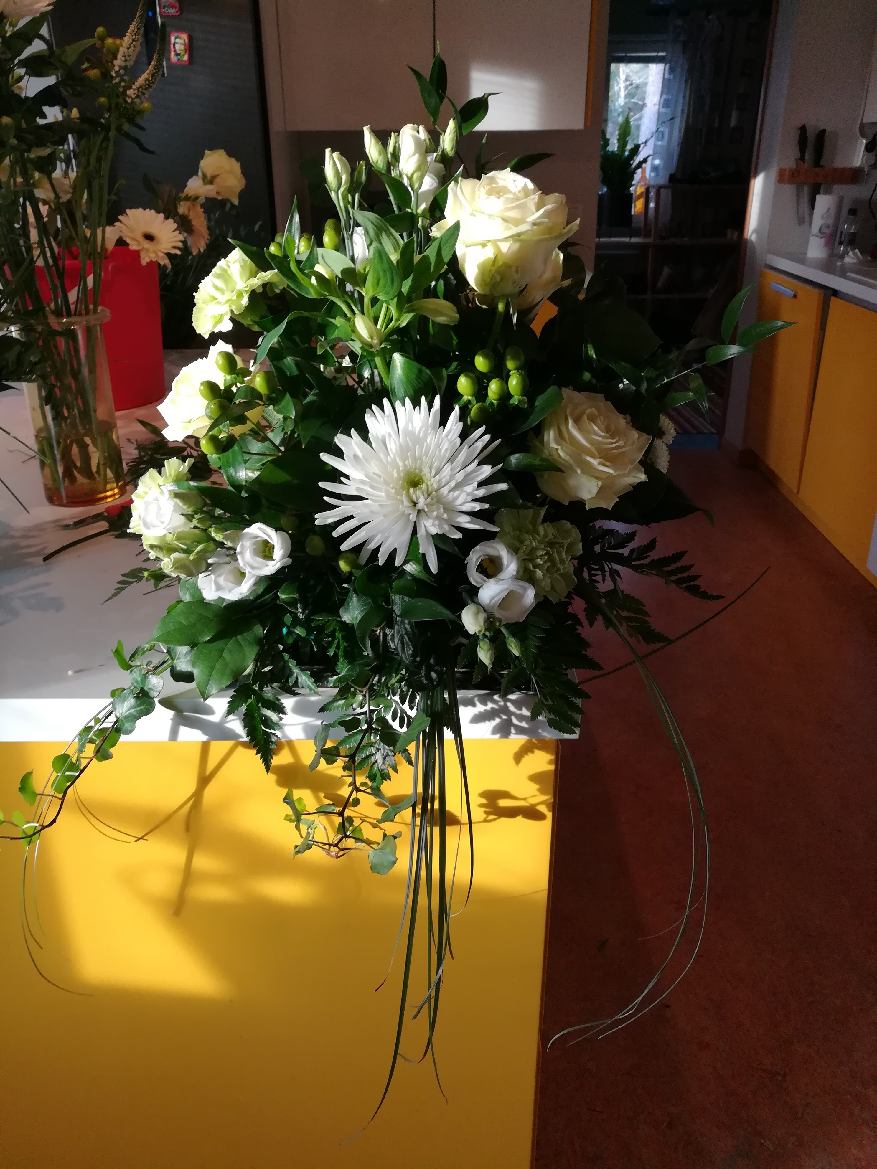 11. Asetelma puhujanpönttöön. Tässä krysanteemia, kuismanmarjaa, inkaliljaa ja neilikkaa.